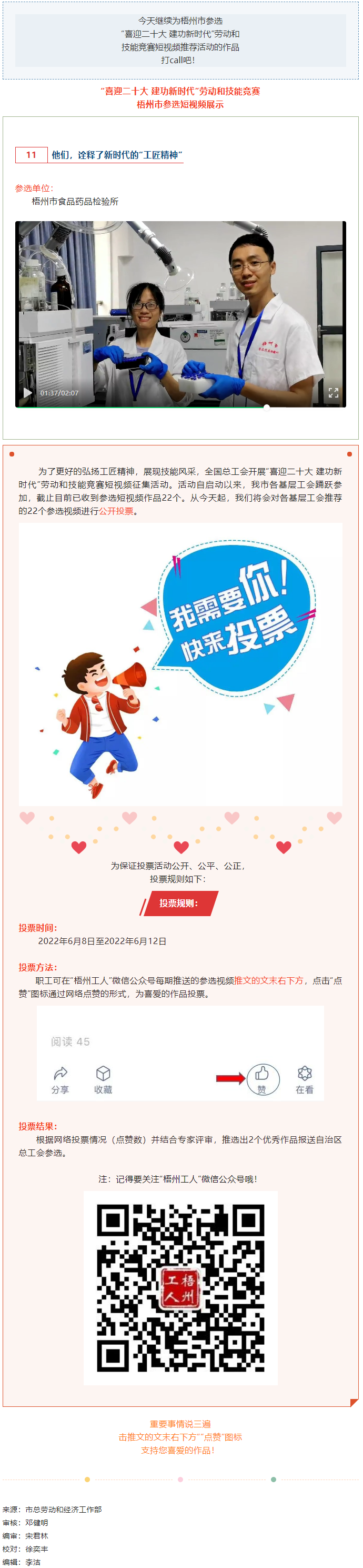 梧州市食品藥品檢驗(yàn)所參選作品丨“喜迎二十大 建功新時(shí)代” 勞動(dòng)和技能競賽短視頻投票活動(dòng)開始啦!
