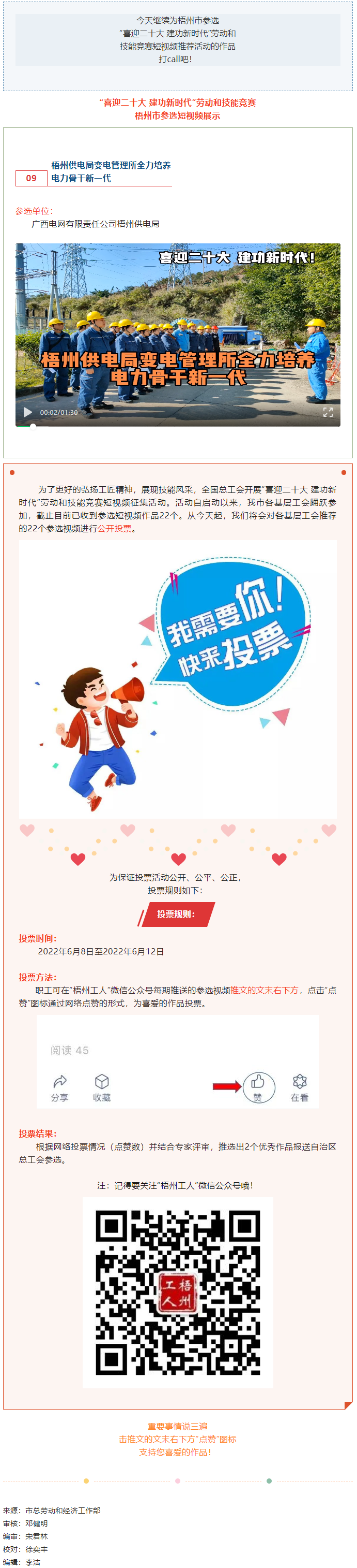 廣西電網(wǎng)有限責(zé)任公司梧州供電局參選作品(一)丨“喜迎二十大 建功新時(shí)代” 勞動(dòng)和技能競(jìng)賽短視頻投票活動(dòng)開(kāi)始啦!