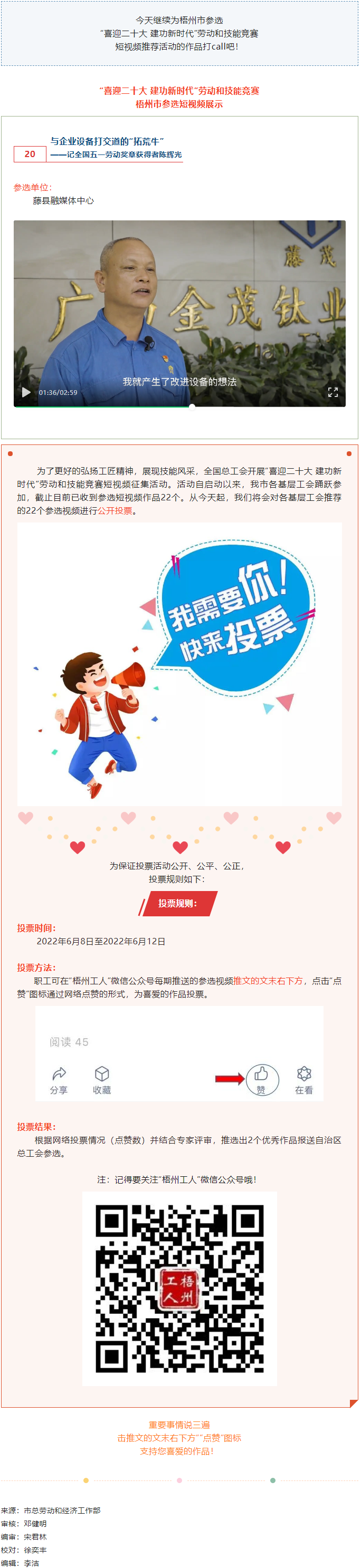 藤縣融媒體中心參選作品丨“喜迎二十大 建功新時代” 勞動和技能競賽短視頻投票活動開始啦!