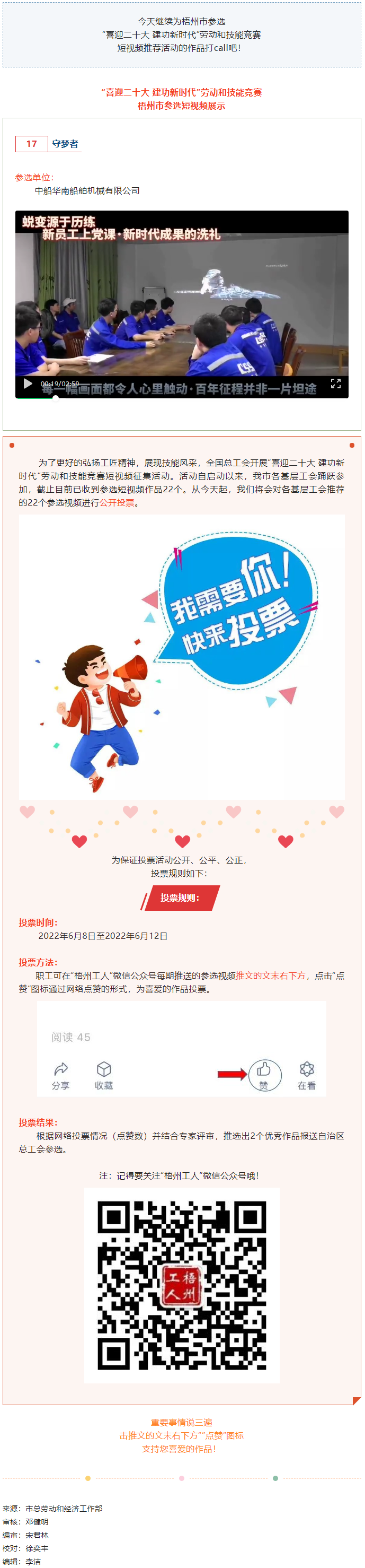 中船華南船舶機械有限公司參選作品(一)丨“喜迎二十大 建功新時代” 勞動和技能競賽短視頻投票活動開始啦!