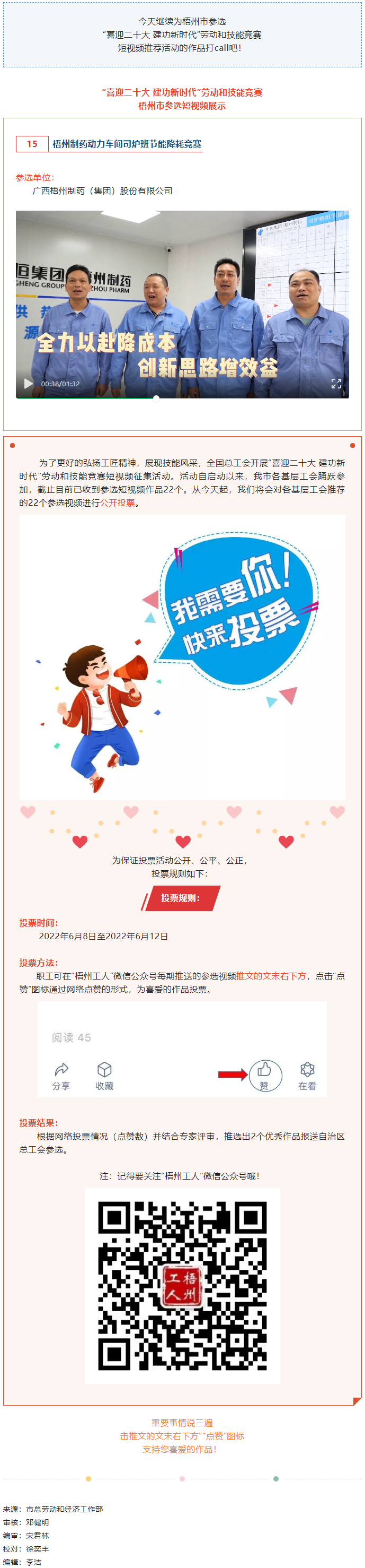 廣西梧州制藥(集團(tuán))股份有限公司參選作品丨“喜迎二十大 建功新時(shí)代” 勞動(dòng)和技能競(jìng)賽短視頻投票活動(dòng)開(kāi)始啦!