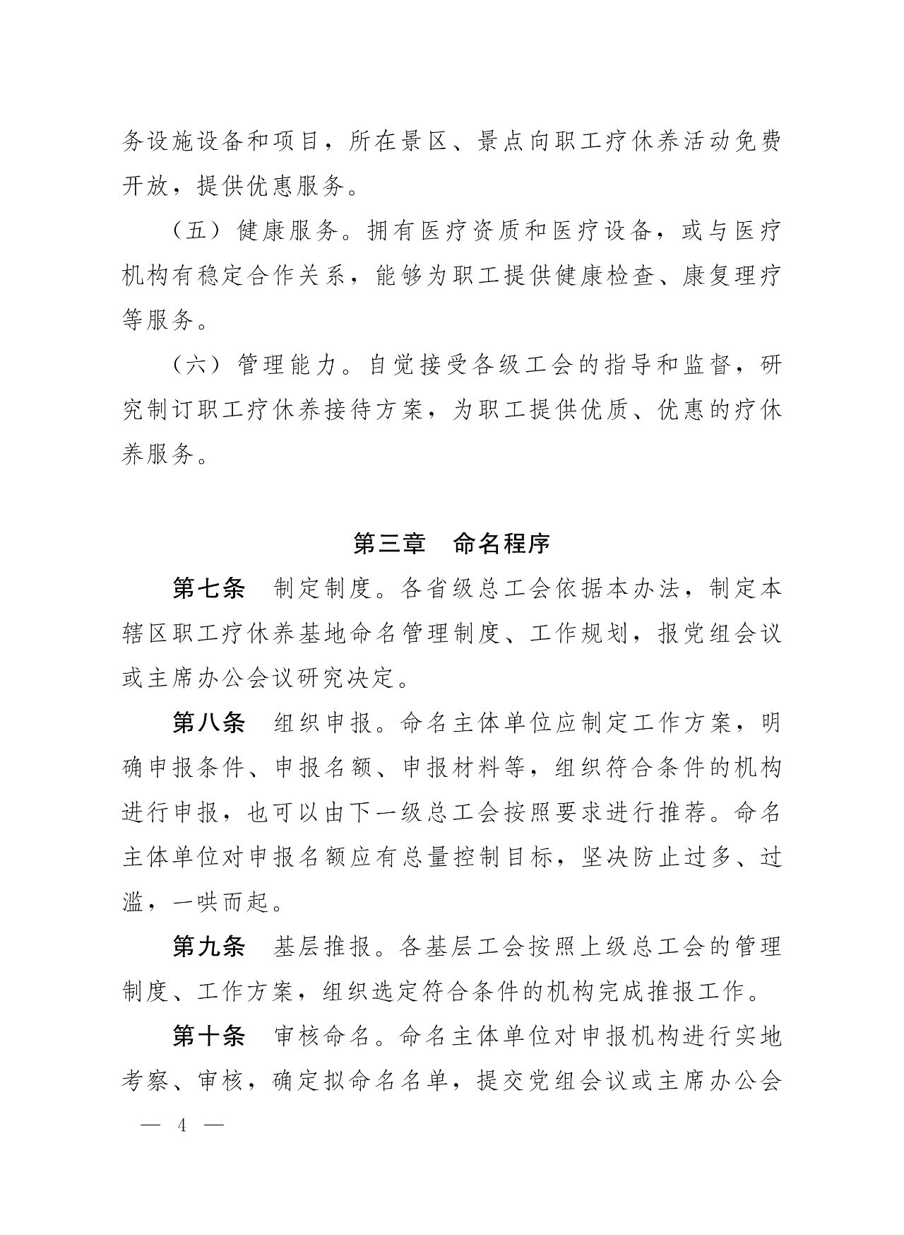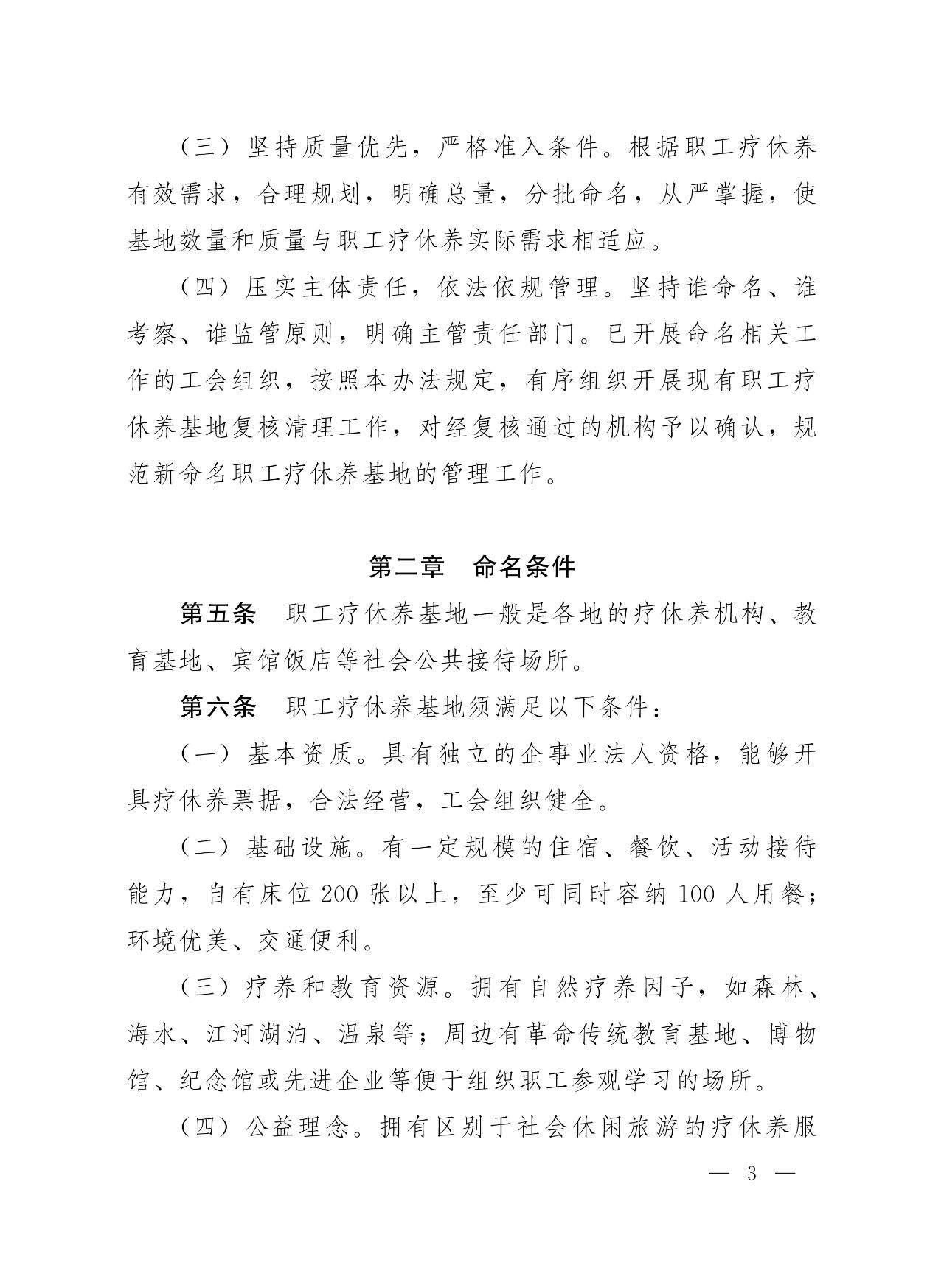 《辦法》明確,職工療休養(yǎng)基地是工人療休養(yǎng)院功能的補充和拓展,由各省級(含)以上總工會根據(jù)工作需要命名。基地命名應(yīng)堅持立足功能定位,突出療休養(yǎng)功能;利用社會資源,服務(wù)職工群眾;堅持質(zhì)量優(yōu)先,嚴格準入條件;壓實主體責(zé)任,依法依規(guī)管理的原則。