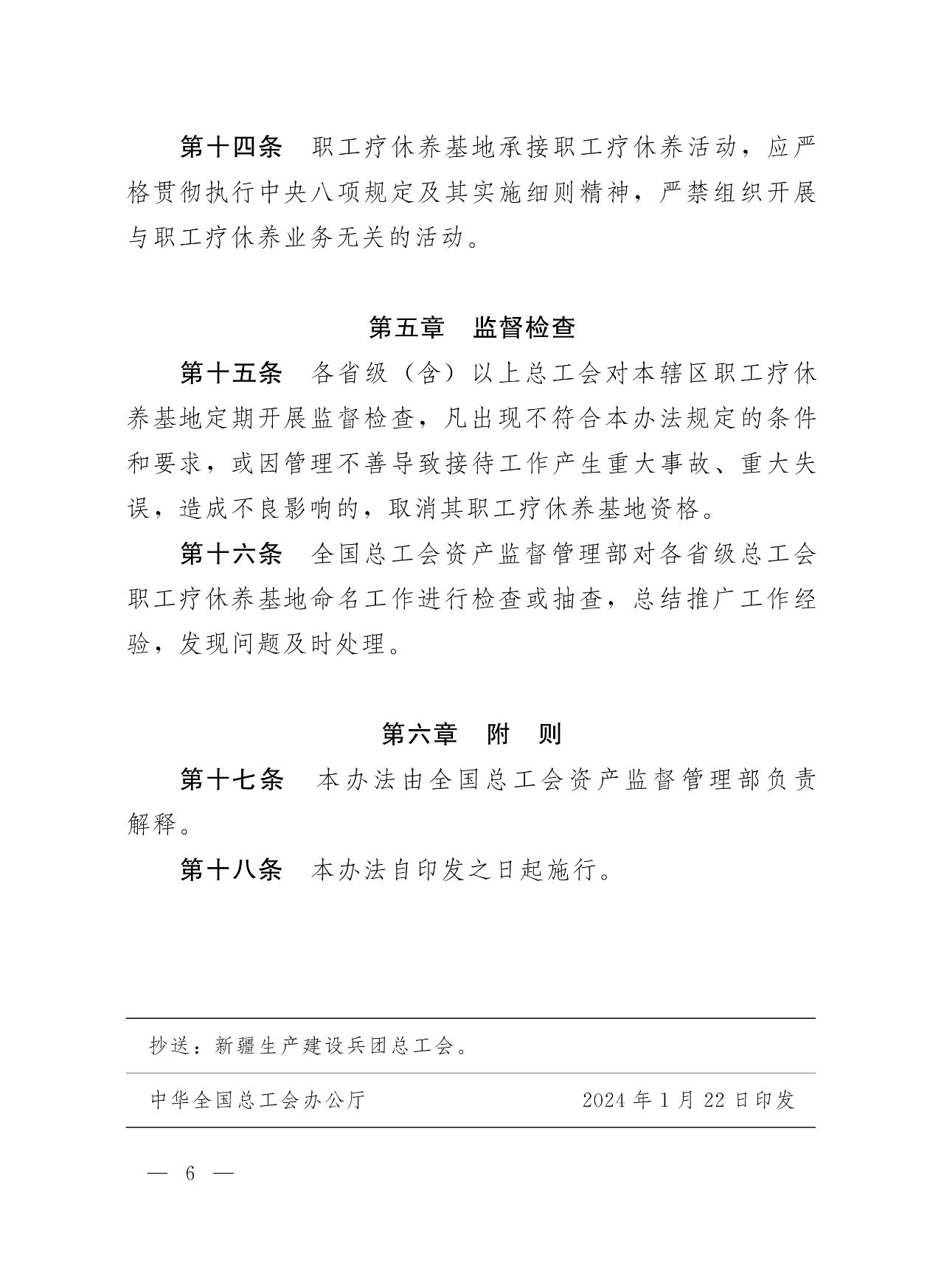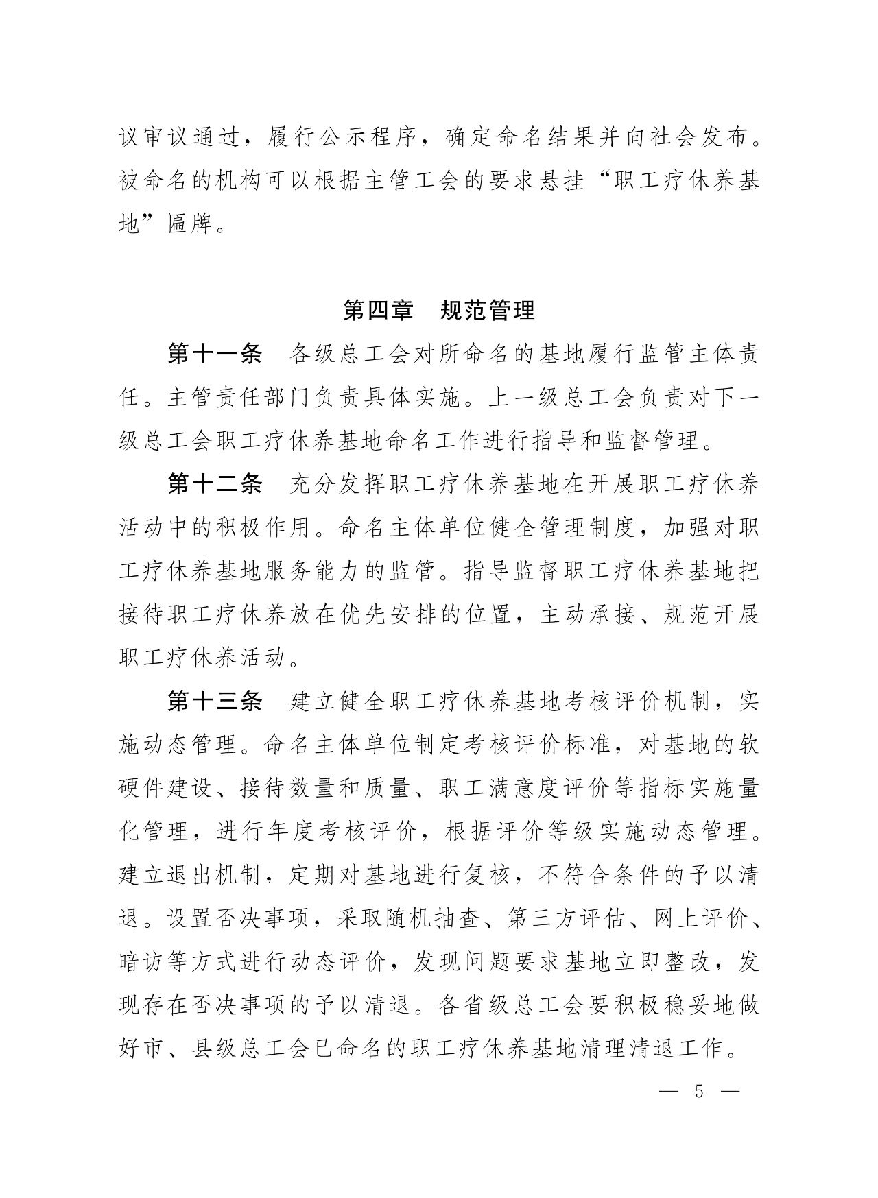 《辦法》要求,各省級總工會制定本轄區(qū)基地命名管理制度、工作規(guī)劃,履行制定制度、組織申報、基層推報、審核命名等命名程序。各級總工會對所命名的基地履行監(jiān)管主體責(zé)任,健全管理制度,加強指導(dǎo)監(jiān)督,定期監(jiān)督檢查。充分發(fā)揮基地在開展職工療休養(yǎng)活動中的積極作用。建立考核評價機制、退出機制,制定考核評價標準,設(shè)置否決事項,實施動態(tài)管理。