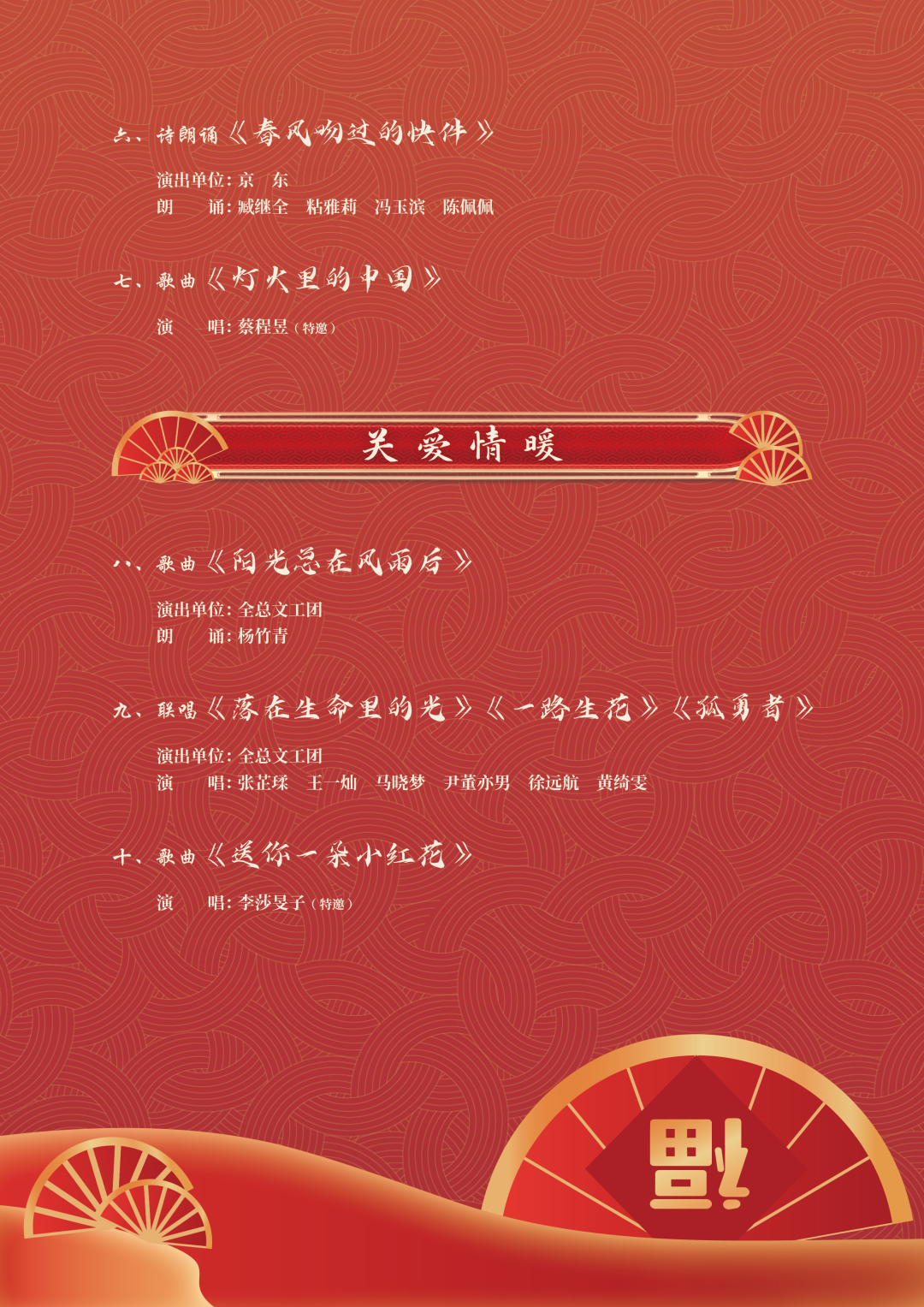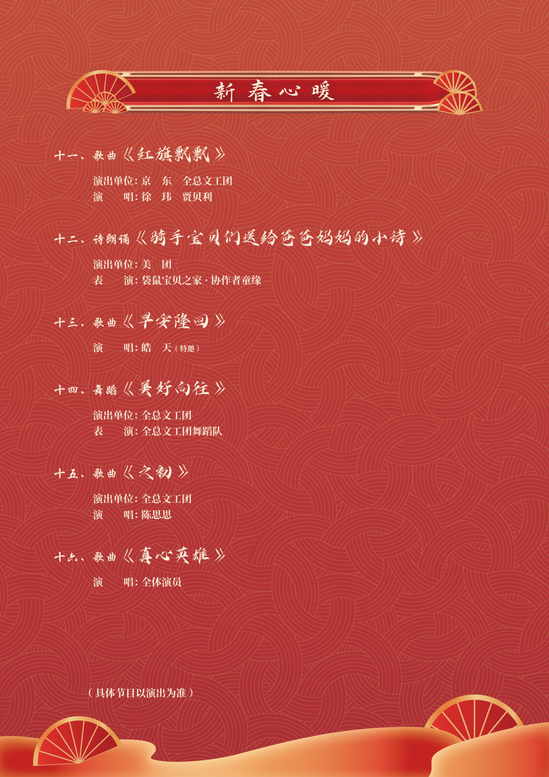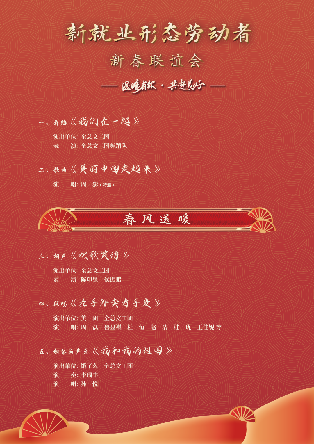 此次活動(dòng)以“溫暖有你 共赴美好”為主題,突出喜慶、溫暖、美好的主基調(diào),分為“春風(fēng)送暖、關(guān)愛情暖、新春心暖”三個(gè)篇章,通過文藝工作者與新就業(yè)形態(tài)勞動(dòng)者同臺(tái)演出的聯(lián)誼活動(dòng),讓廣大職工感受到“娘家人”的關(guān)心和節(jié)日的溫暖,是在農(nóng)歷春節(jié)即將到來之際,面向全體新就業(yè)形態(tài)勞動(dòng)者和全國廣大職工開展的一次文化送溫暖活動(dòng)。