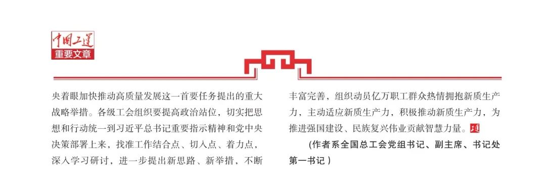 發(fā)展新質(zhì)生產(chǎn)力,是以習(xí)近平同志為核心的黨中央著眼加快推動(dòng)高質(zhì)量發(fā)展這一首要任務(wù)提出的重大戰(zhàn)略舉措。各級(jí)工會(huì)組織要提高政治站位,切實(shí)把思想和行動(dòng)統(tǒng)一到習(xí)近平總書記重要指示精神和黨中央決策部署上來,找準(zhǔn)工作結(jié)合點(diǎn)、切入點(diǎn)、著力點(diǎn),深入學(xué)習(xí)研討,進(jìn)一步提出新思路、新舉措,不斷豐富完善,組織動(dòng)員億萬職工群眾熱情擁抱新質(zhì)生產(chǎn)力,主動(dòng)適應(yīng)新質(zhì)生產(chǎn)力,積極推動(dòng)新質(zhì)生產(chǎn)力,為推進(jìn)強(qiáng)國建設(shè)、民族復(fù)興偉業(yè)貢獻(xiàn)智慧力量。